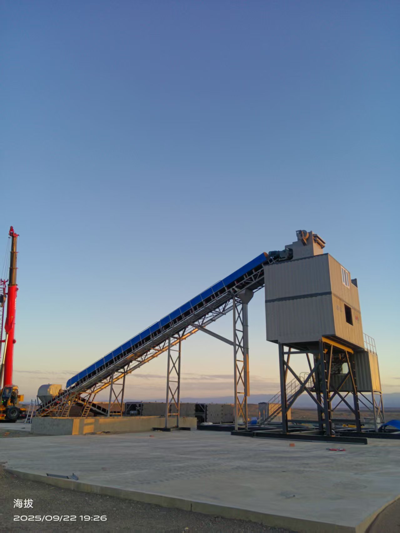 Today: Installed the rain shelter, erected the inclined belt, guided chute, and flat belt.